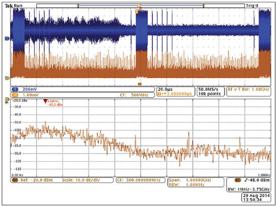 然而,混合域示波器(MDO)的推出使情況有了改觀,它能提供同步的而且與時間相關(guān)聯(lián)的觀察和測量功能。如圖5所示的這種儀器能夠相當(dāng)容易地讓我們觀察哪個信號與哪個EMI事件同時發(fā)生,從而可以簡化EMI排查過程。